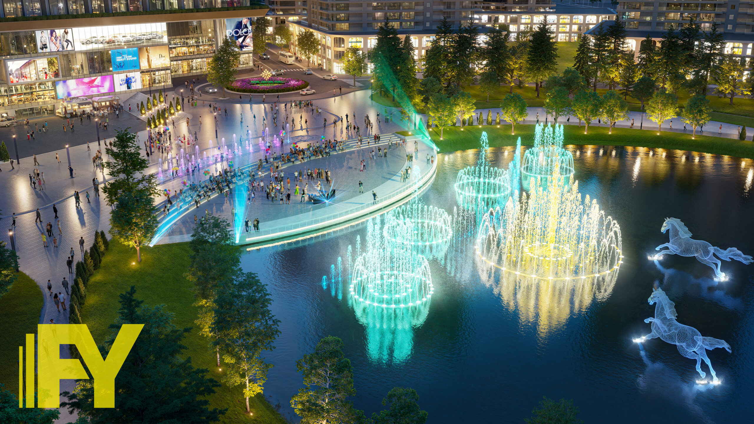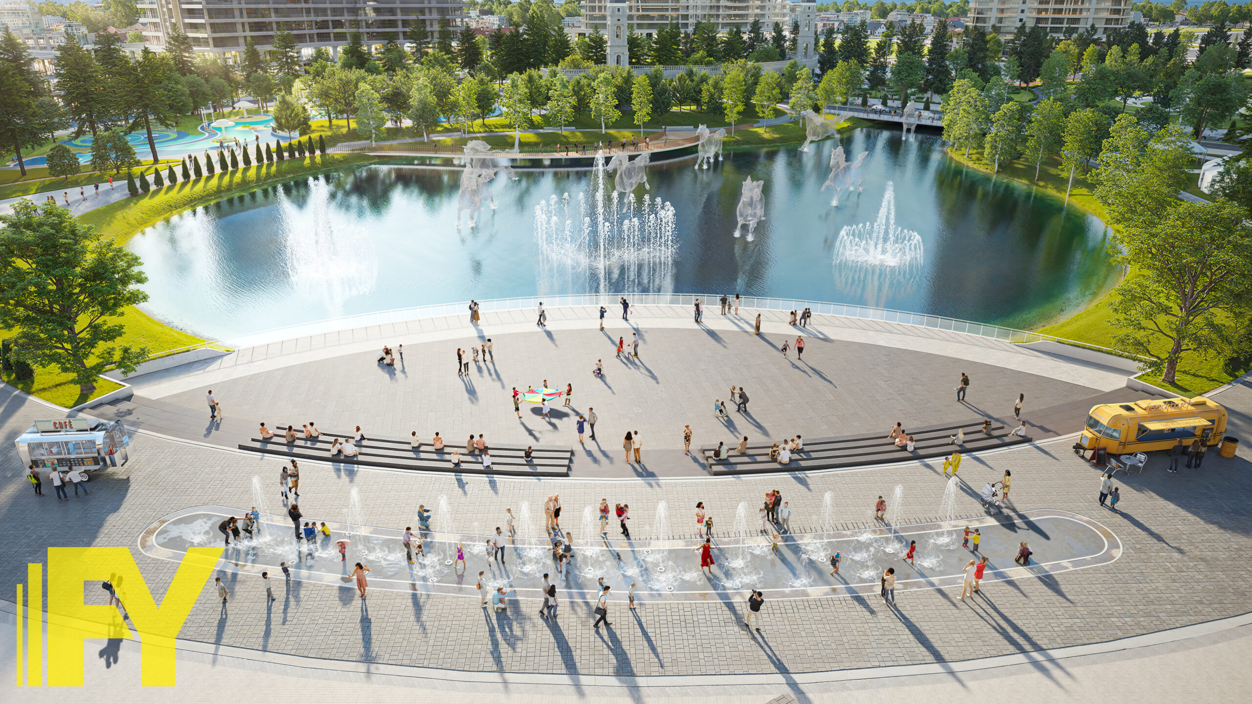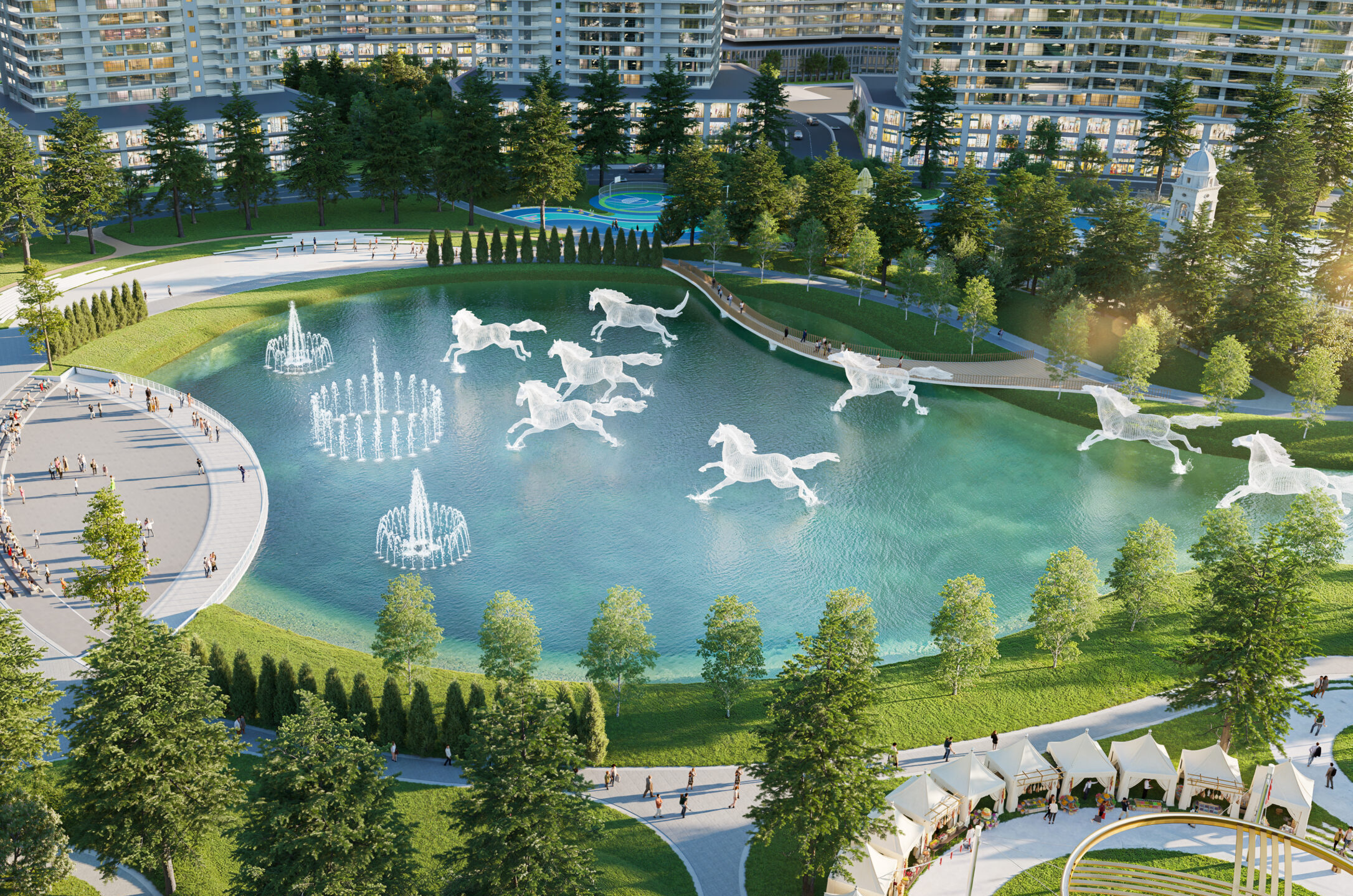 • Пейзажное озеро, фонтан, художественные скульптуры