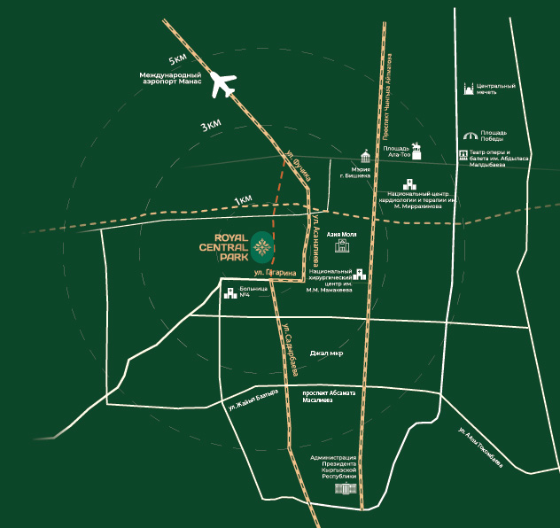 Жилое пространство ориентировано на сохранение и развитие культурных и природных ценностей, гармоничное сочетание с местным образом жизни при полном наборе современных международных удобств и сервисов у дверей дома, обеспечивая интегрированный образ жизни: проживание — работа — отдых — наслаждение — всего в нескольких неспешных шагах. Создавая новый стандарт жизни, Роял Сентрал Парк (Royal Central Park) становится первопроходцем на рынке недвижимости Кыргызстана и центром инвестиционного притяжения Центральной Азии.